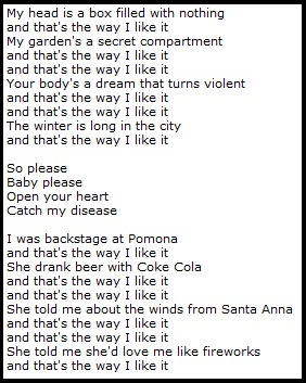 I don’t really understand what he is accomplishing with this song. What disease is it that I am meant to be catching? You were backstage at Pomona and then a mysterious woman was drinking Coke (nice product name drop by the way – hope they sent you a pallet), who’s apparently from Santa Ana, who apparently loves him like she loves fireworks.