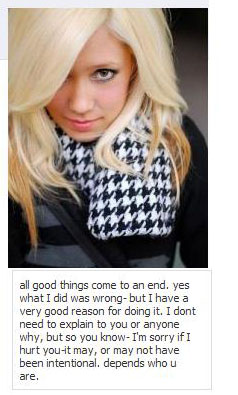 As for the story, well, May eventually renamed her alter-ego’s profile to an alternate version of her real name and updated it with pictures of herself. So now she’s just running two profiles as herself… The way I perceived it as it originally occurred, the alter-ego was an attempt to portray the image of the person she really wanted to be, but wasn’t in real-life. A model having fun, mingling with attractive people, etc etc. Who knows if people like that ever wake-up to themselves.