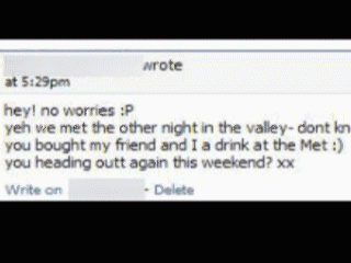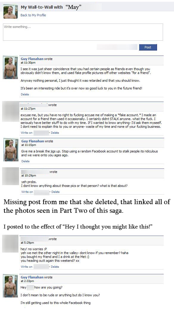 We were shocked… then proceeded to laugh our asses off for about 15 minutes. She was serious! She met my fake person in a Valley nightclub, and I apparently bought her and her friends a drink… I was lost for words at her stupidity. I didn’t even bother waiting. I had already assembled the evidence and had it ready to hot link into my next post on May’s wall. I think pictures speak louder than words (it’s Facebook so remember to read from the bottom upwards):